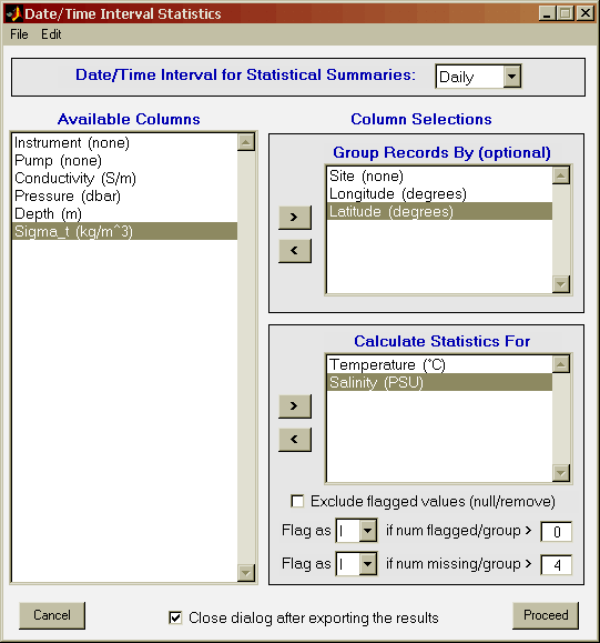 Date/Time Interval Statistics (ui_aggrdatetime) -- Dialog for creating customized statistical summaries for specifed date/time intervals (yearly, monthly, daily, hourly), optionally grouping by values in one or more non-date/time columns.