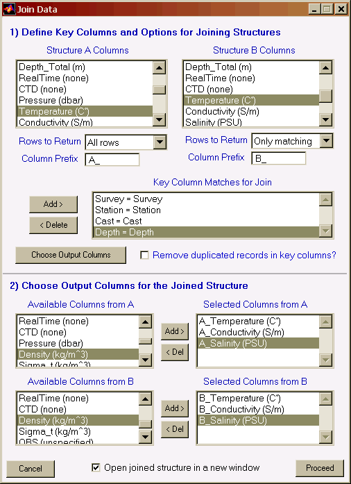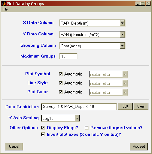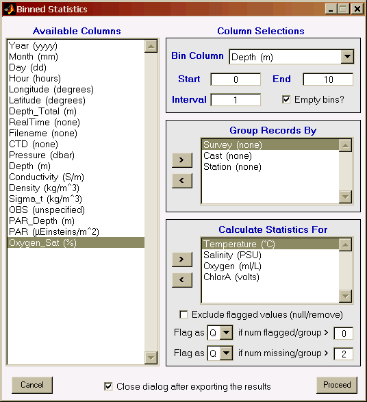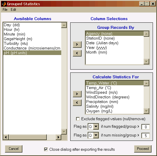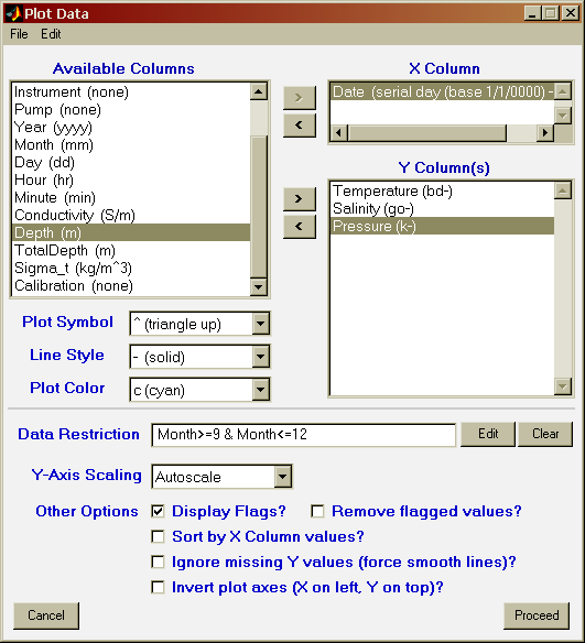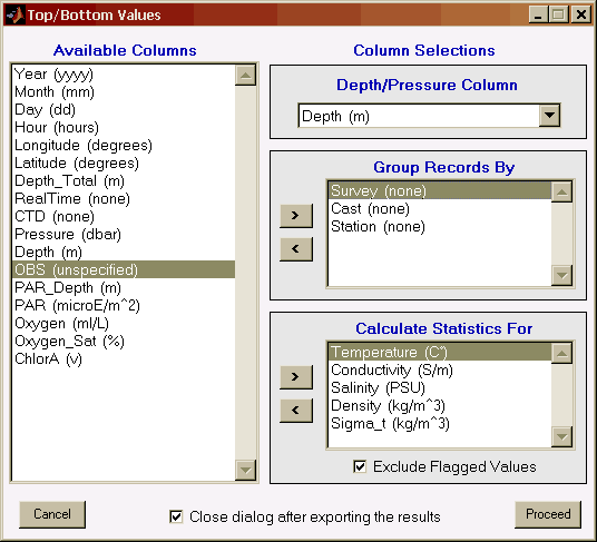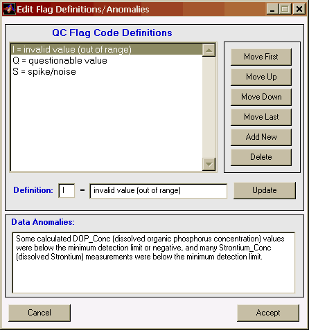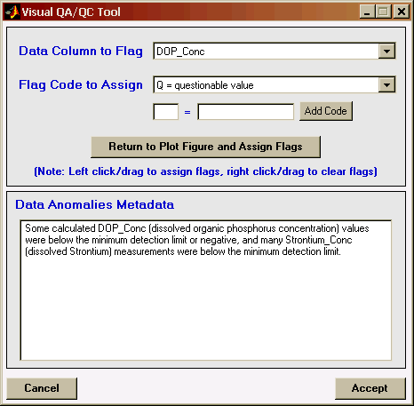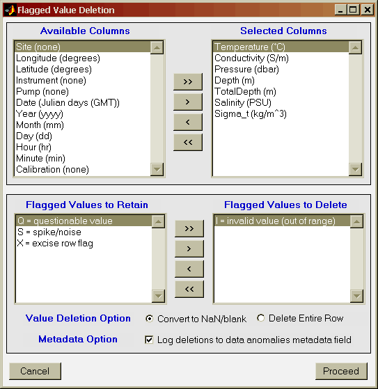 Data Removal Dialog (ui_clearflags) -- GUI dialog for selectively deleting data values or data rows based on QA/QC flag assignments. Subsets of data columns and flag definitions can be selected from lists of all available columns and definitions. The functions 'nullflags' or 'cullflags' are used to clear the affected values or rows,
