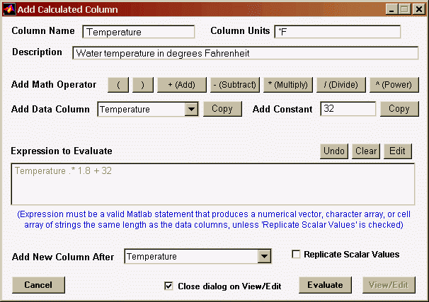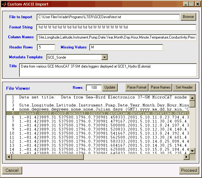 Import dialog (ui_importfilter) -- Dialog for customized importing of delimited ASCII text files. Support is provided for non-standard header formats and multiple missing value codes, and format strings and column titles can be automatically parsed or entered manually. An interactive file viewer display is also provided.