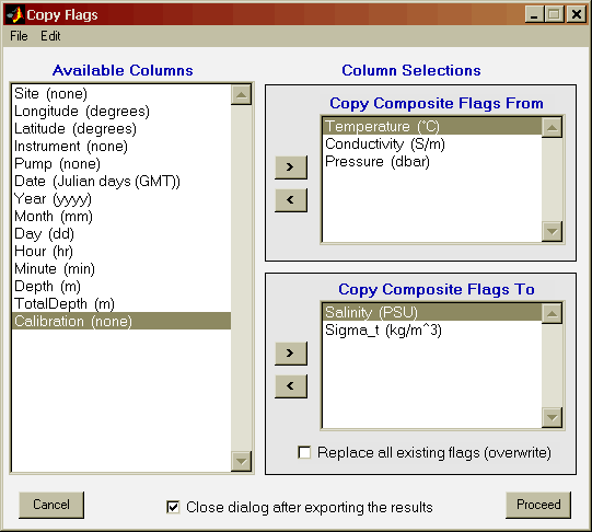 QA/QC Flag Copying Dialog (ui_copyflags) -- GUI dialog for copying composite flags from one or more columns and adding them to or replacing the existing flag arrays of one or more other columns (used to propagate flags to dependent/calculated columns)