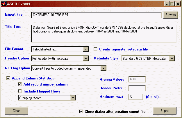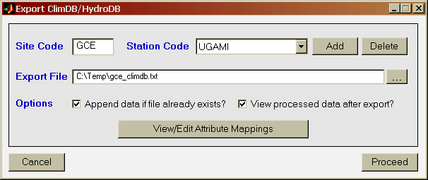 dialog (ui_expclimdb) -- Dialog for exporting data sets as comma-delimited text files in LTER ClimDB/HydroDB format. Data sets are automatically