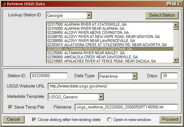 USGS WWW Import dialog (ui_harvestusgs) -- GUI dialog for retrieving data from the USGS WWW server. Real-time, daily and finalized data can be retrieved for any supported station for the specified number of days. A list of Real-time stations is provided for look-up by state.