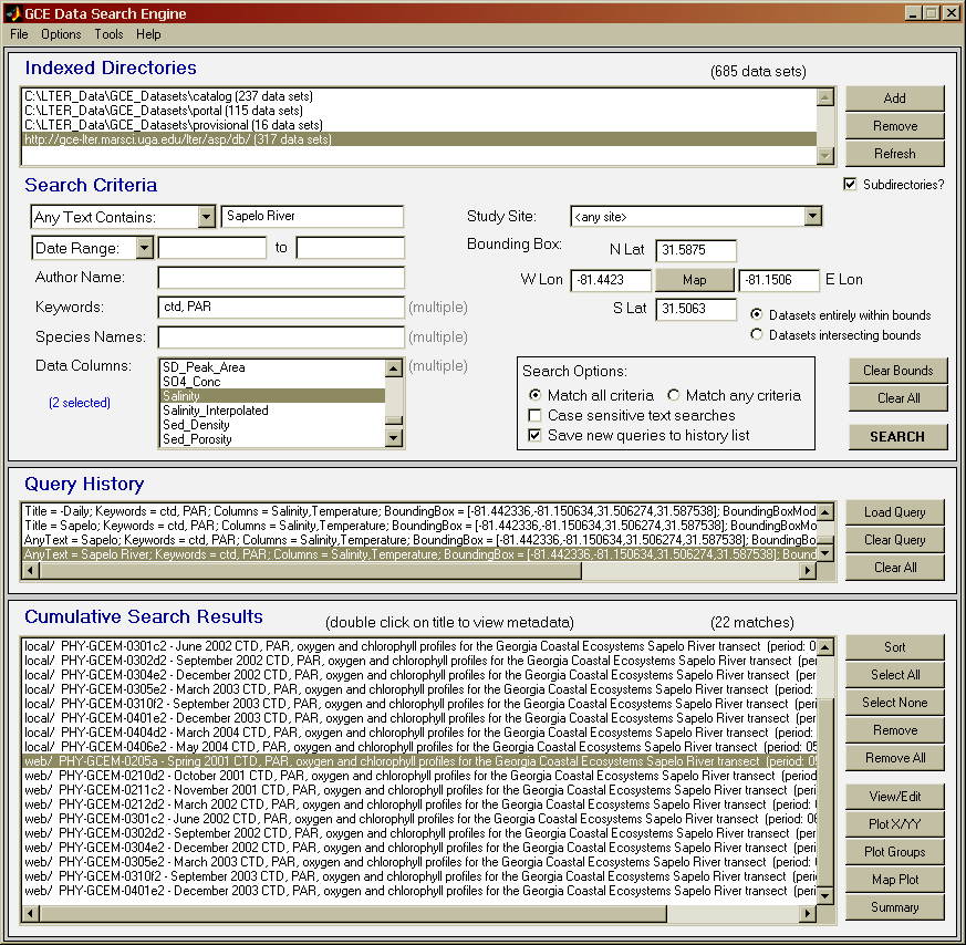 specific thematic, temporal, and geospatial criteria. In order to support searching, data structures are first analyzed using a combination of metadata and data mining techniques to generate an optimized search index. Data structures stored in MATLAB files in any number of local directories can be indexed, and indices can be saved and re-used to speed subsequent searches. Pre-generated indices of public data sets in the GCE Data Catalog and GCE Data Portal can also be downloaded and merged with local indices to support simultaneous searches of local and web-based data holdings.