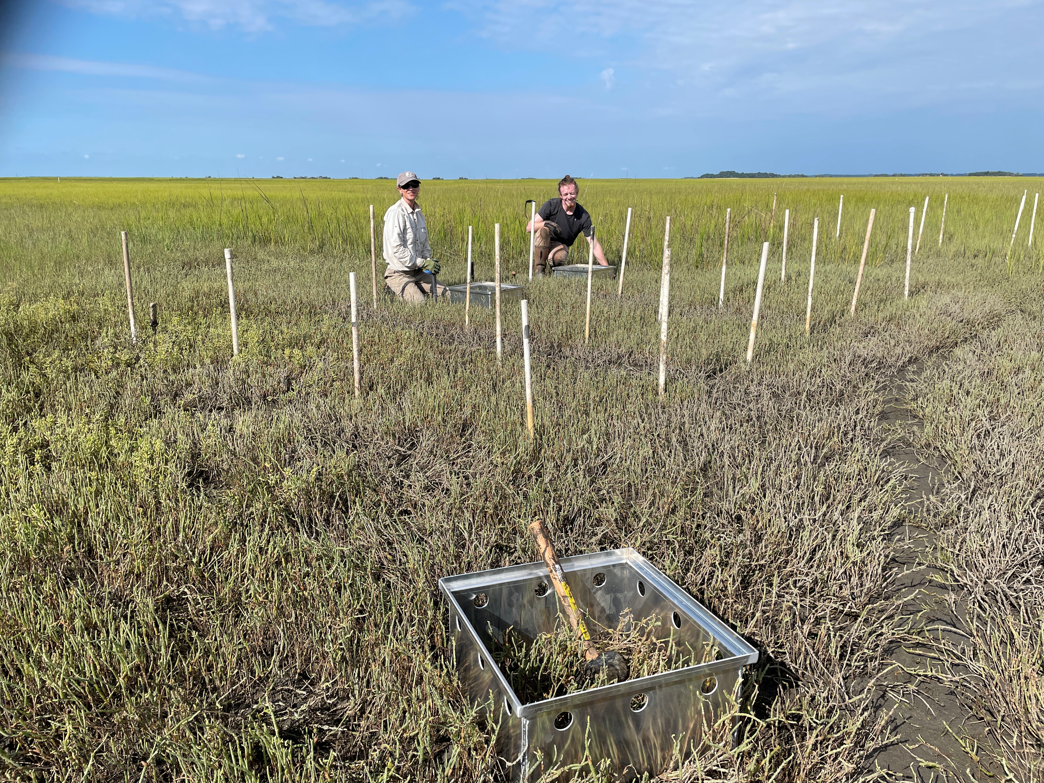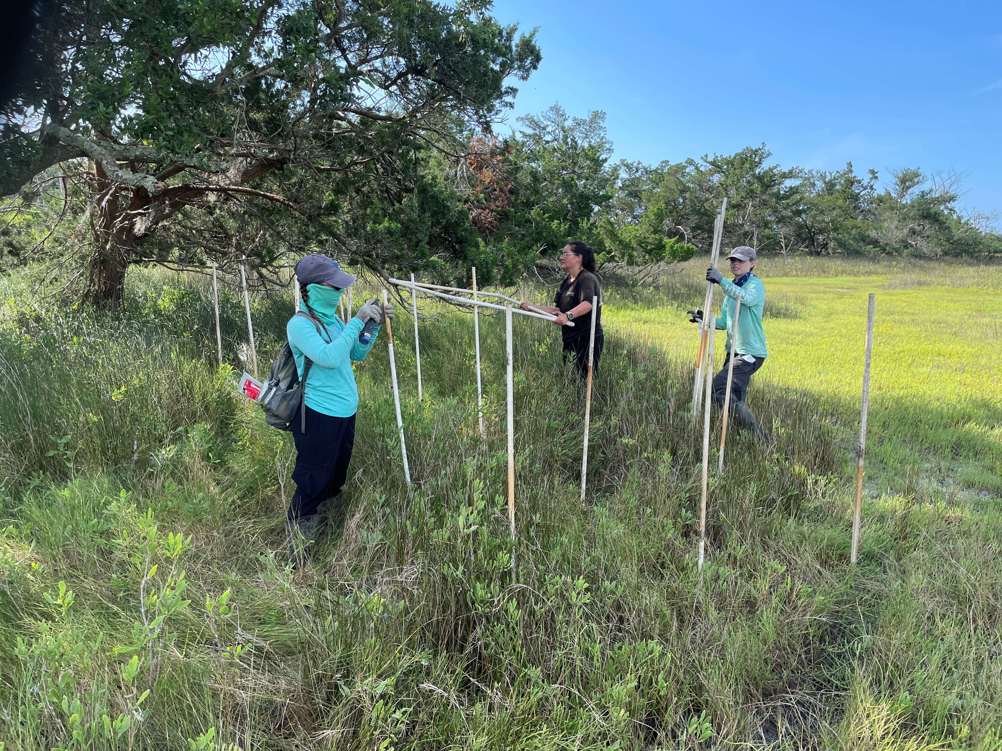 GCE AnnouncementField Program NewsInstalling upland variability plots One of the central aspects of the GCE V proposal is a set of field sampling campaigns focused around variability. The first of these explores the possibility that system variability increases near "transitions" in the system. To start exploring this, we established sets of plots approaching transitions at marsh landing. One set of plots is located above and below the transition from Spartina-dominated marsh to succulent-dominated marsh. Another set of plots is located above and below the transition from high marsh to forest. A large field team, led by Amanda Spivak, Alicia Wilson, Georgianne Moore and Steve Pennings set up the plots in July, for sampling at a later date. (Contact Steve Pennings for additional information) submitted Jul 07, 2025 |