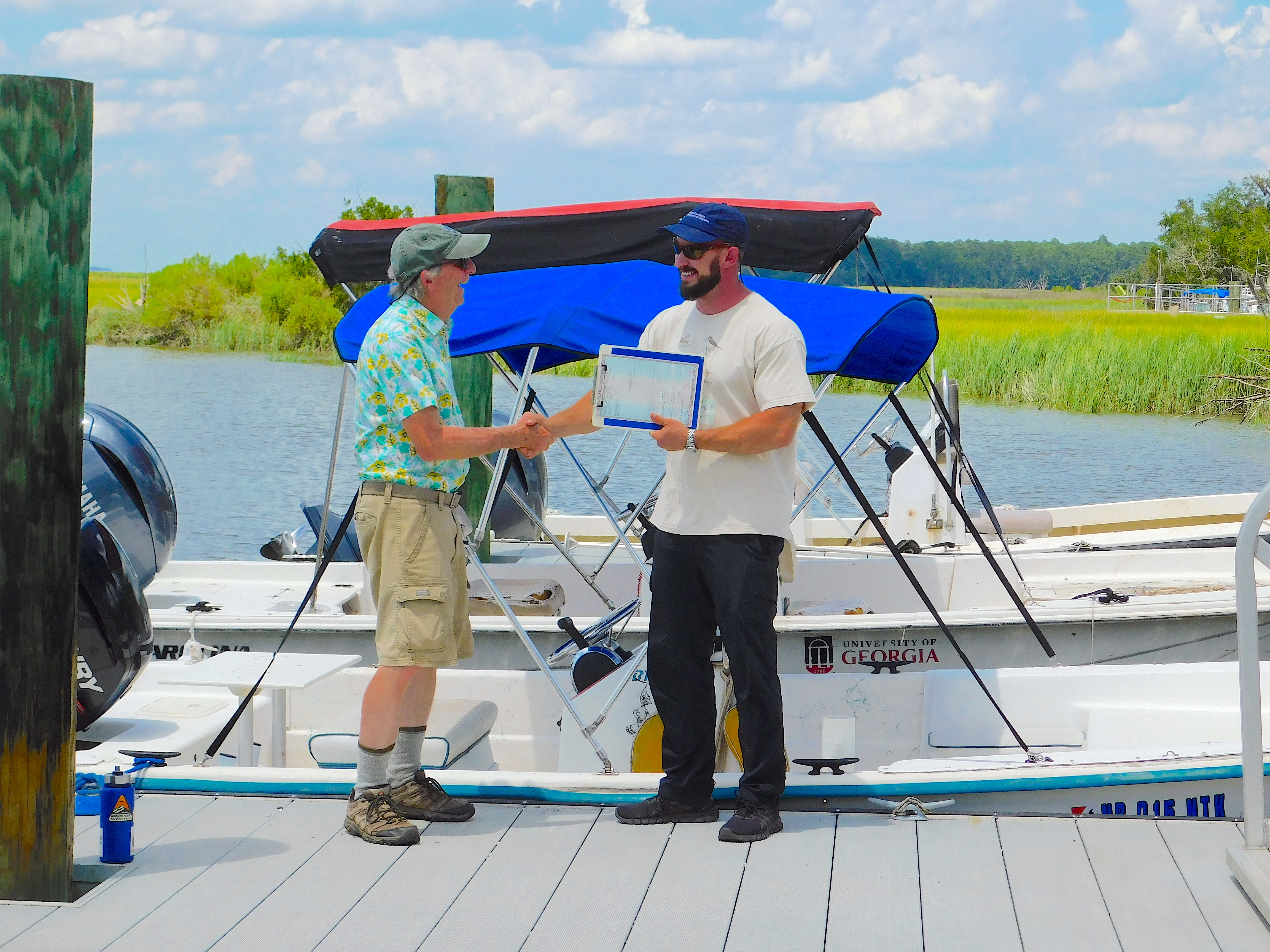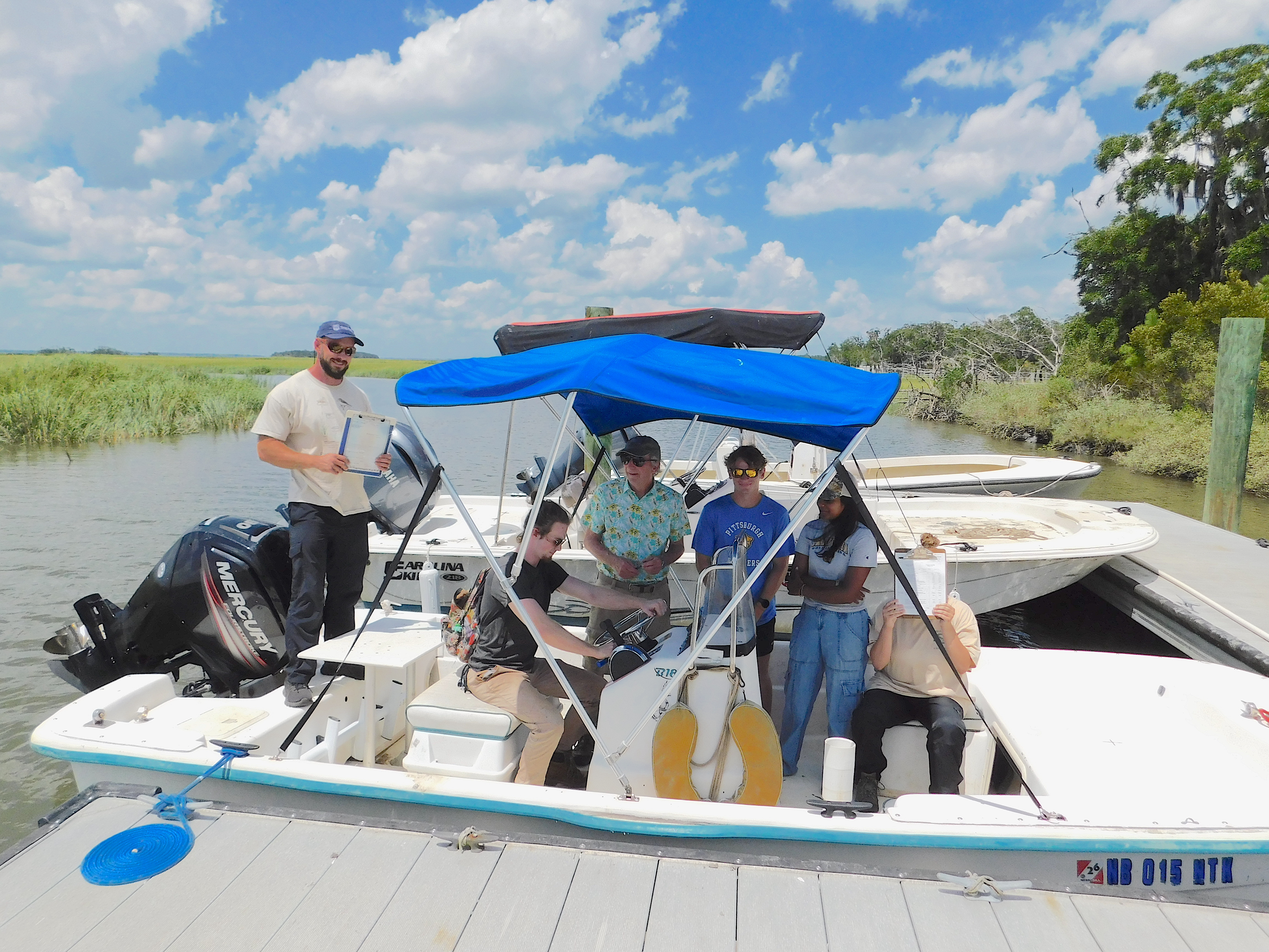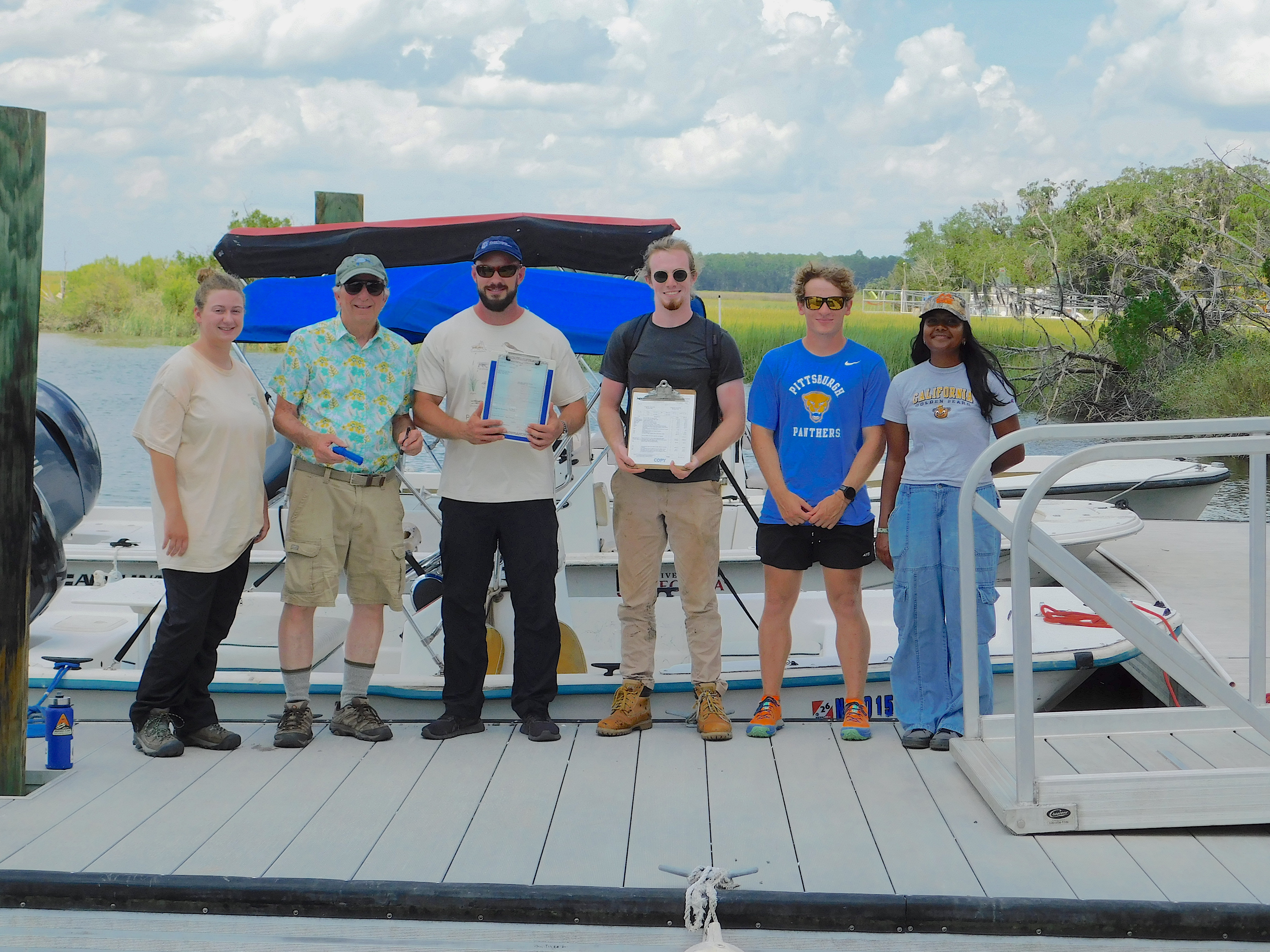 GCE AnnouncementField Program NewsCreighton University Boat Transferred to GCE On July 21, 2025, Creighton University, represented by Dr. John Schalles, donated the RV Tiny Dancer to the GCE LTER. The Tiny Dancer, a 2003 Sundance B18 Skiff, has served Dr. Schalles well over the years, facilitating inland and coastal research in Georgia, Florida, South Carolina, Mississippi, Maryland, Delaware, Nebraska, Minnesota, Iowa, and Indiana. A 2017 Mercury ELPT Command Thrust 4 stroke engine, and 2013 Magic Tilt aluminum trailer were included with the boat. The Tiny Dancer will allow the field crew to expand operations and is a welcome addition to the GCE fleet. Many thanks to Dr. Schalles and Creighton University for graciously facilitating the transfer. From left to right in the following image: Paige Wilkins, Dr. John Schalles, John Williams, CJ Sides, Brendan Hallisey, and Sahana Chandran. Emily Pace and Nick Macias were also present at the ceremony.