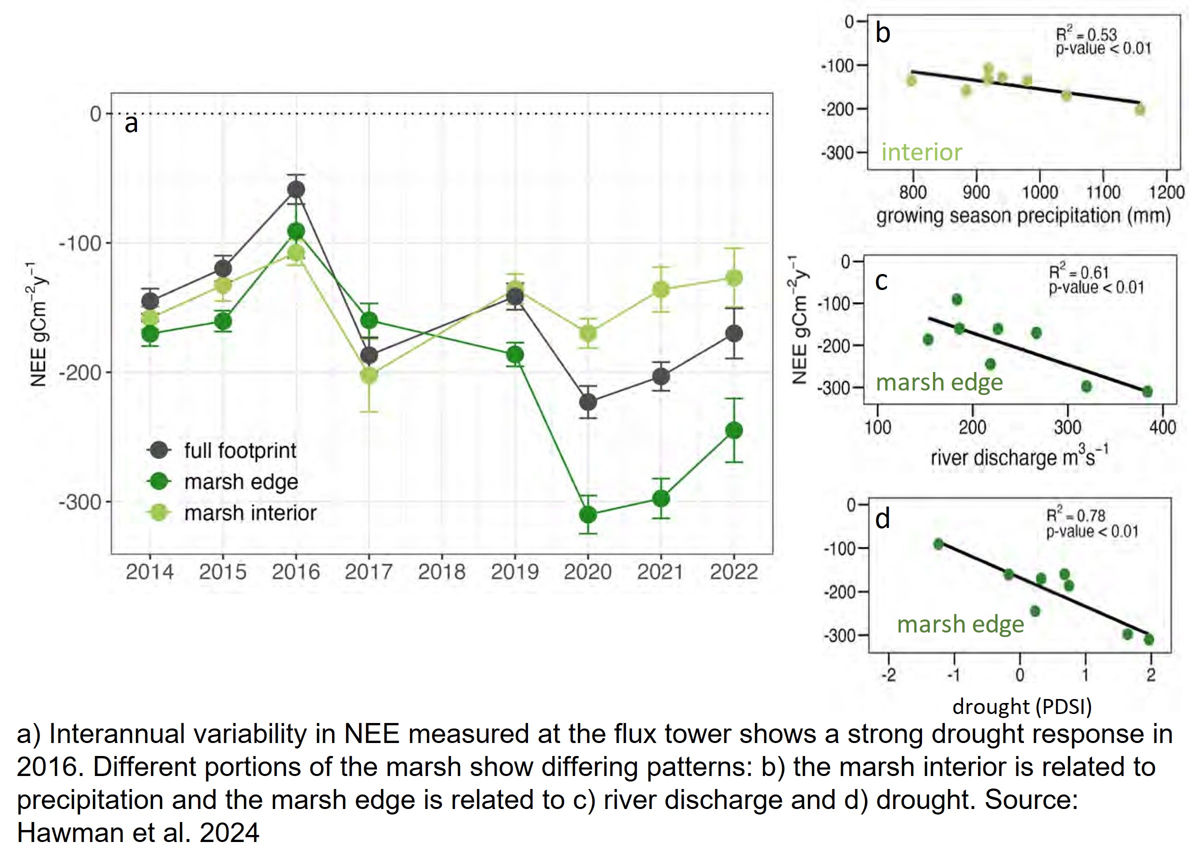 Hawman, P., Mishra, D., O'Connell, J.L., Cotten, D.L., Narron, C. and Mao, L. 2021. Salt Marsh Light Use Efficiency is Driven by Environmental Gradients and Species-Specific Physiology and Morphology. Journal of Geophysical Research: Biogeosciences. 126. (DOI: https://doi.org/10.1029/2020JG006213)