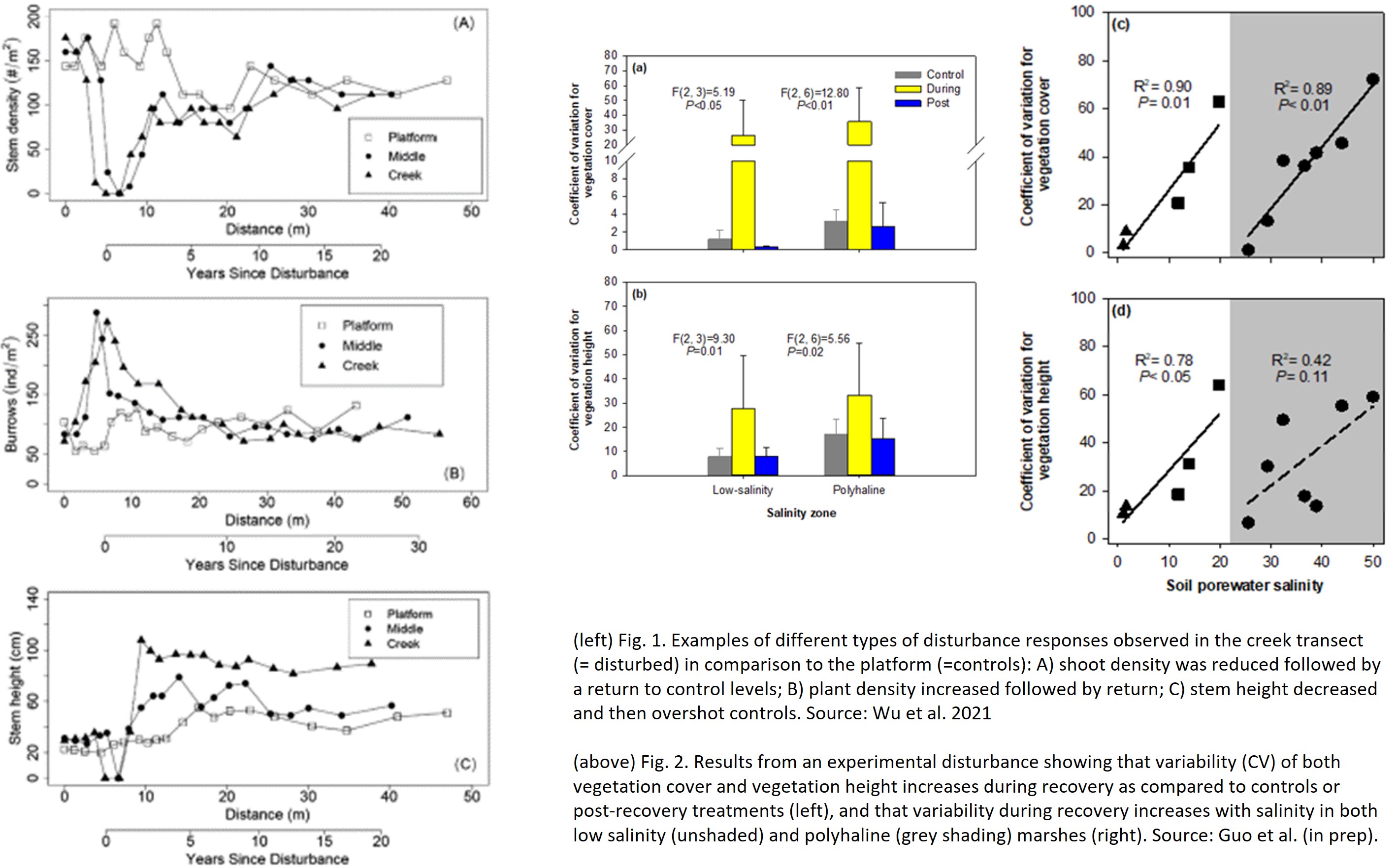 Responses of salt marshes to disturbanceDisturbance responses are fundamentally important in most ecosystems, as they can affect population densities, nutrient pools, and ecological processes. However, there is a gap between simple conceptual models of disturbance recovery and the complex processes observed in empirical studies. GCE researchers are addressing that gap with ongoing and recently completed studies of disturbance in tidal marshes. Wu et al. (2021) evaluated disturbance caused by headward-eroding creeks as they move into the marsh platform over time. They found multiple patterns of disturbance magnitude and recovery trajectory over an array of 19 variables that included soil characteristics, primary producers, and benthic invertebrates, with some declining sharply, some not affected, and others increasing (and in some cases overshooting controls) (Fig. 1). These results, along with the results of following field plots as they recover from wrack disturbance (Grissett et al., in prep), belie any simple univariate understanding of "disturbance and recovery" and suggest that reducing the dimensionality of a data set can obscure disturbance response. Guo et al. (subm.) demonstrated that underlying abiotic gradients can also affect recovery rates. They found that 1) recovery from experimental disturbance of 12 coastal marsh sites located along a salinity gradient decreased with increasing soil porewater salinity, 2) variance during recovery was consistently elevated compared to both controls and recovered plots (Fig. 2 left), and 3) variance during recovery was correlated with both salinity and recovery rate (Fig. 2 right). These results have implications for the theory of critical slowing down, as this research represents an experimental demonstration that recovery times increase in response to an underlying environmental gradient. These findings also suggest that increased variance can be used to infer recent past disturbance. We are planning to follow up on these ideas with experimental manipulations that evaluate standardized disturbances across salinity and elevation gradients. |