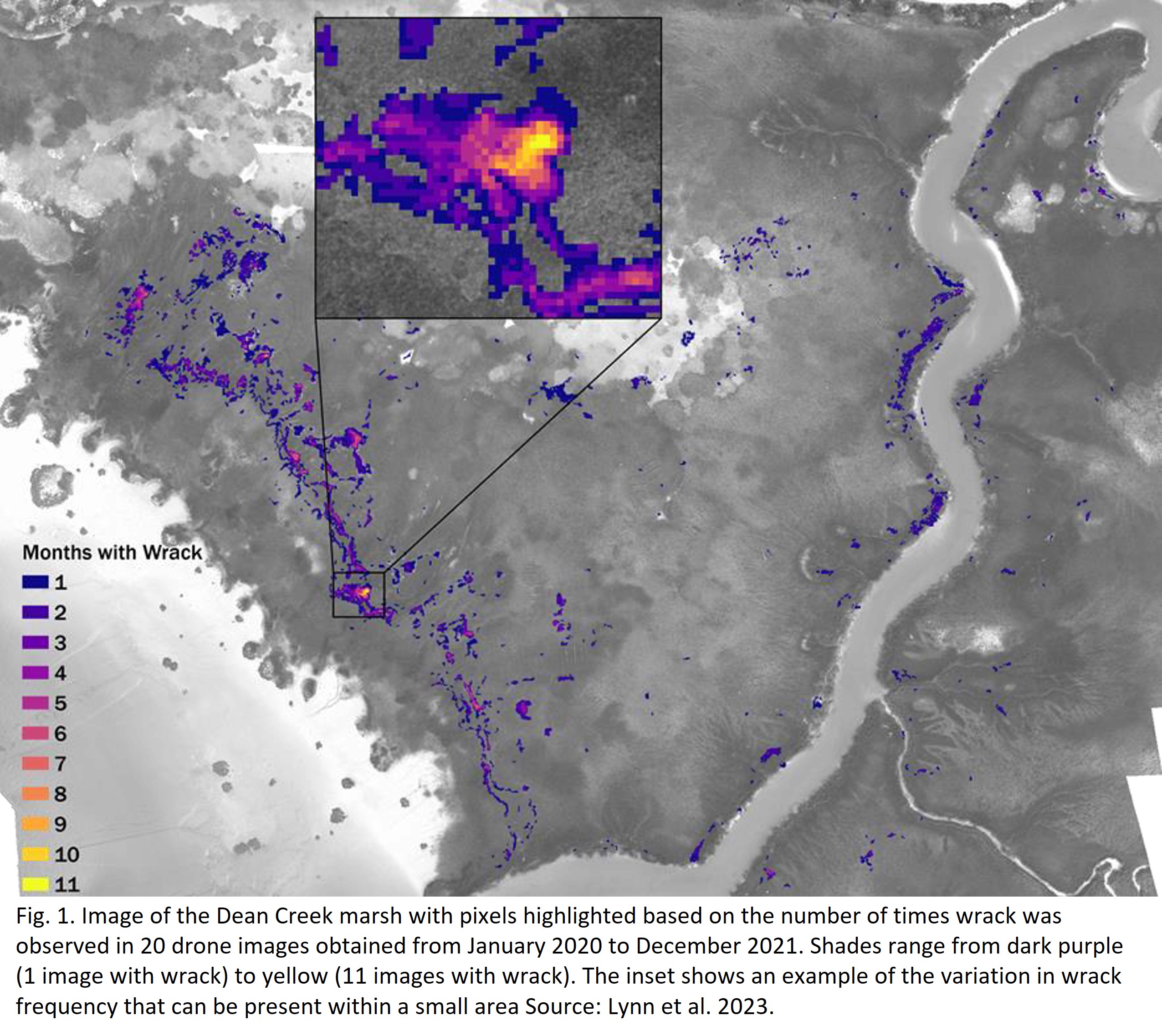 Fig. 1. Image of the Dean Creek marsh with pixels highlighted based on the number of times wrack was observed in 20 drone images obtained from January 2020 to December 2021. Shades range from dark purple (1 image with wrack) to yellow (11 images with wrack). The inset shows an example of the variation in wrack frequency that can be present within a small area Source: Lynn et al. 2023. |